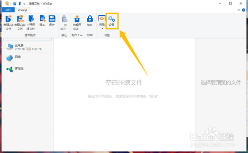 点击上方的“WinZip”菜单项后,在睁开的功能区中选择“设置”图标。