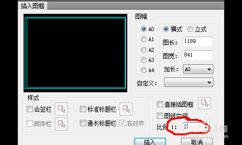 设置图框尺寸为841mm*594mm即为A0图框。