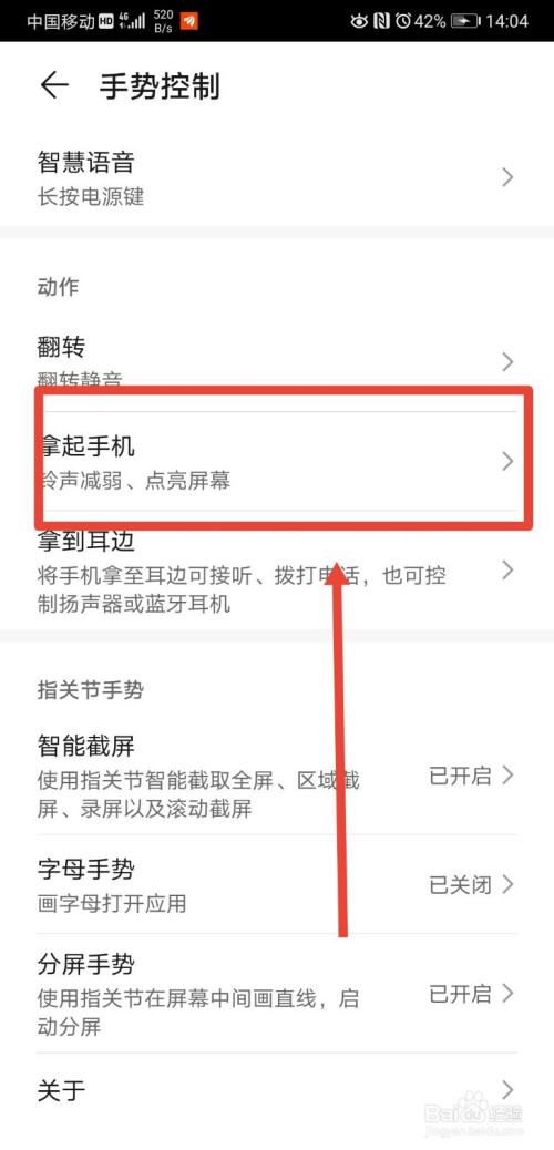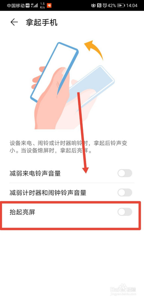 进入到拿起手机功能页面后,可以看到该页面下有个抬起亮屏功能;