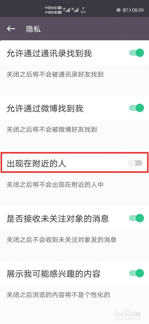 5、点击【呈现在四周的人】后面的灰色按钮即可设置完当作。