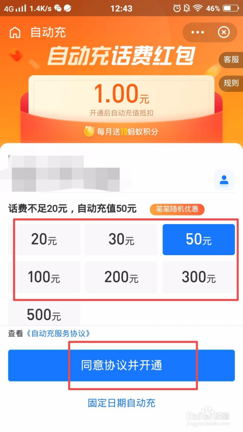 选择主动充值的面额,然后点击【赞成和谈并开通】;