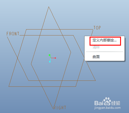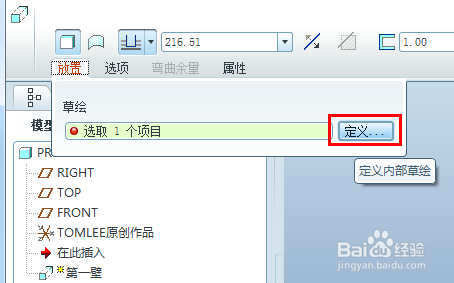 特征操控板点击“放置”——“界说...”,或者模子显示区,按住右键,快捷菜单中点击“界说内部草绘...”,由上面两种方式都可以进入草绘平面的选择。
