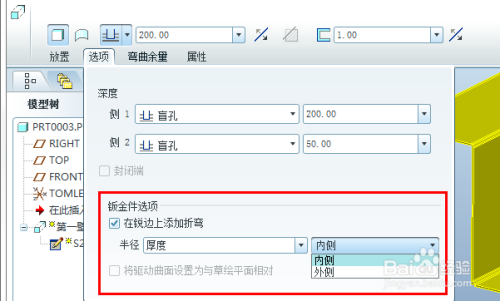 - 拉伸壁草绘时都是画直角,在选项中可以勾选建立折弯半径。