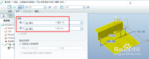 在指定深度拉伸时,还可以从选项中设置往两侧拉伸分歧深度,好比这里设置往Front基准平面两侧别离拉伸50和200的深度。