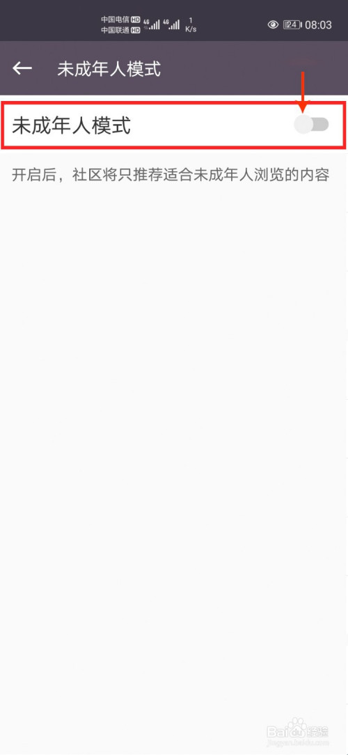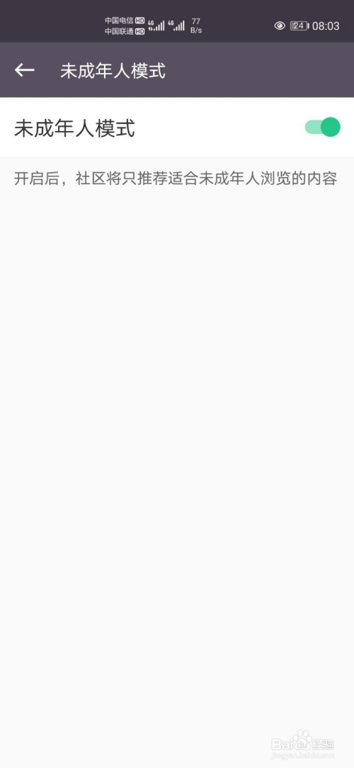 5、点击【未成年人模式】后面按钮即可开启当作功。