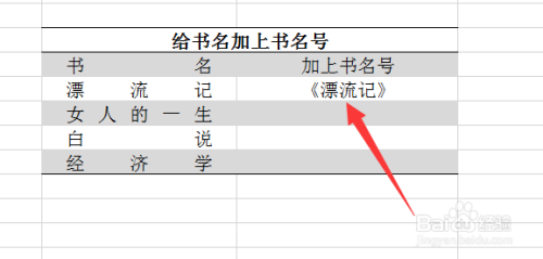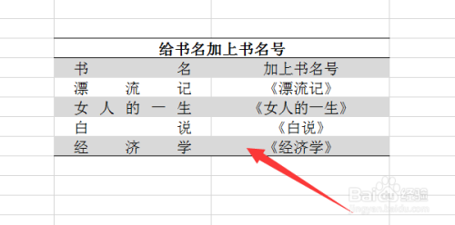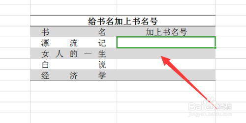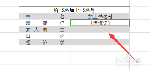 选中刚加好书名的表格,如下图所示,按住快捷键Ctrl+e进行填充即可。
