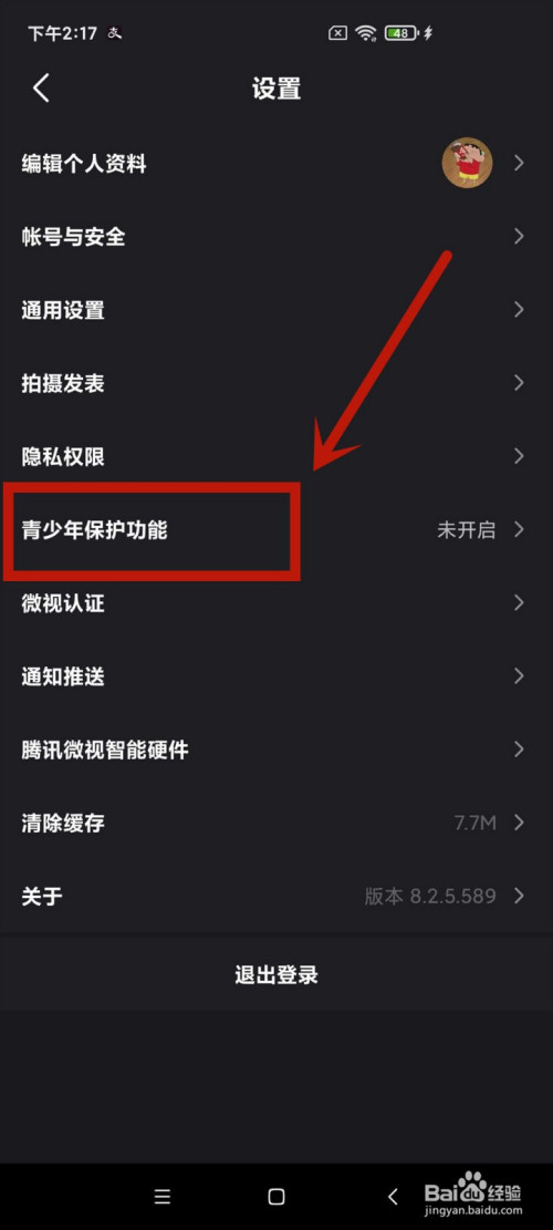 点击打开设置页面的青少年庇护功能选项。