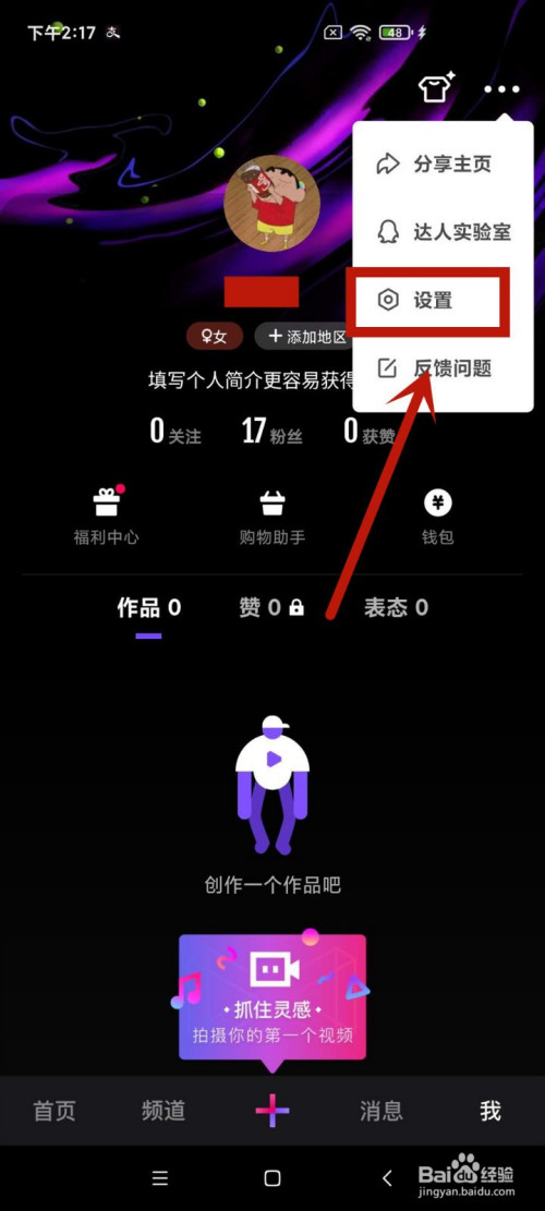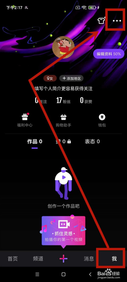 在微视首页,点击右下角的我的,再点击右上角的 ... 小标。