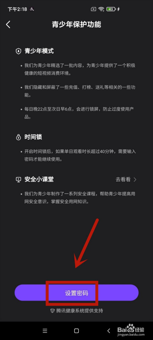2.点击设置,再点击青少年庇护功能进入下方的设置密码。