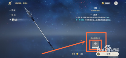 进入精辟界面后,点击同名兵器材料下方的【+】进入。如下图所示