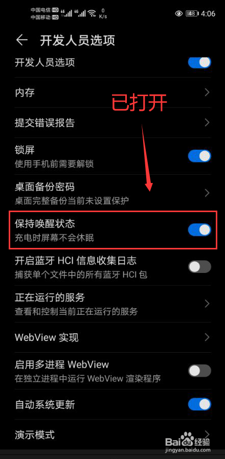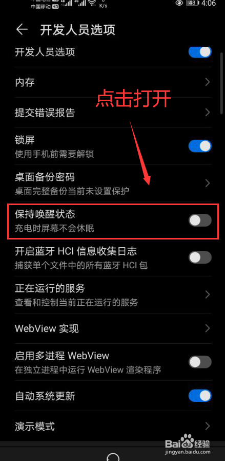 在开辟人员选项中,点击打开连结叫醒状况(图片中圈红的部门)