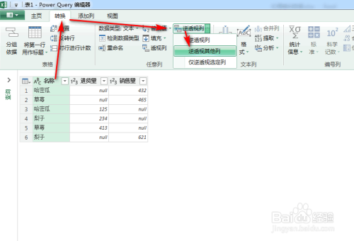 稍等半晌,会进入PowerQuery编纂界面,接着,选中“名称”,点击“转换”---“逆透视列”---“逆透视其他列”,具体如图所示: