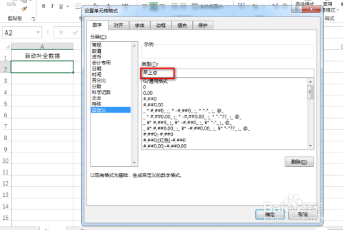在弹出的设置框中,点击“自界说”,并在“类型”中输入:早上@,具体如图所示: