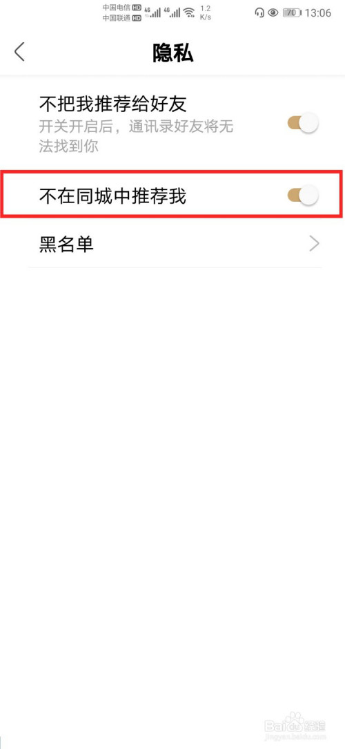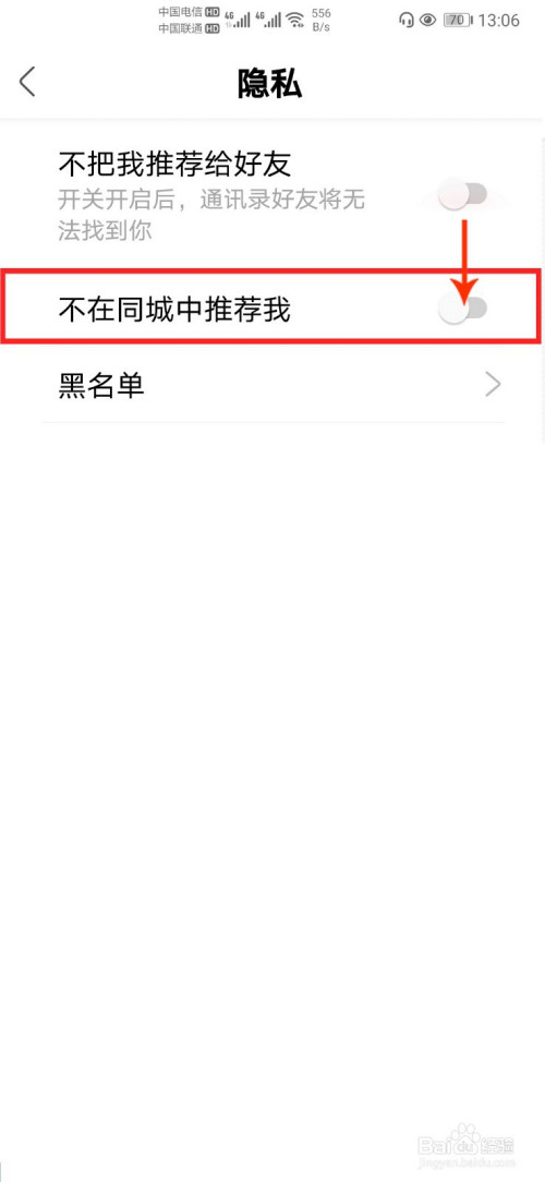 点击【不在同城中保举我】后面的按钮,即可设置完当作。