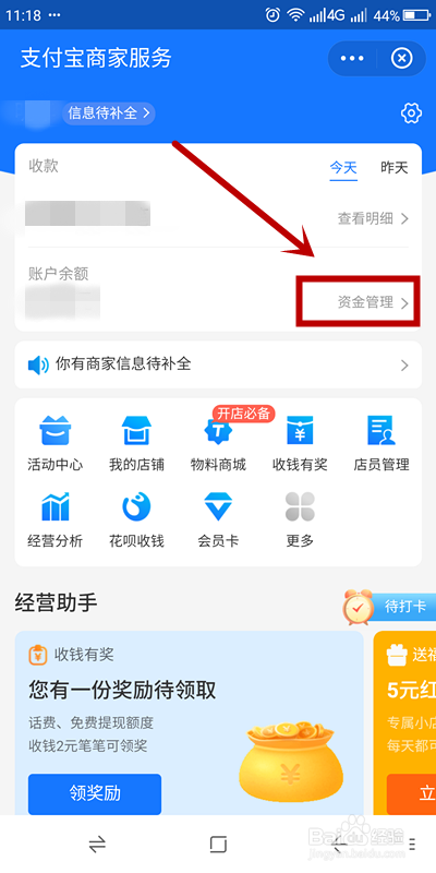 在【支付宝商家办事】页面,找到【资金办理】选项单击