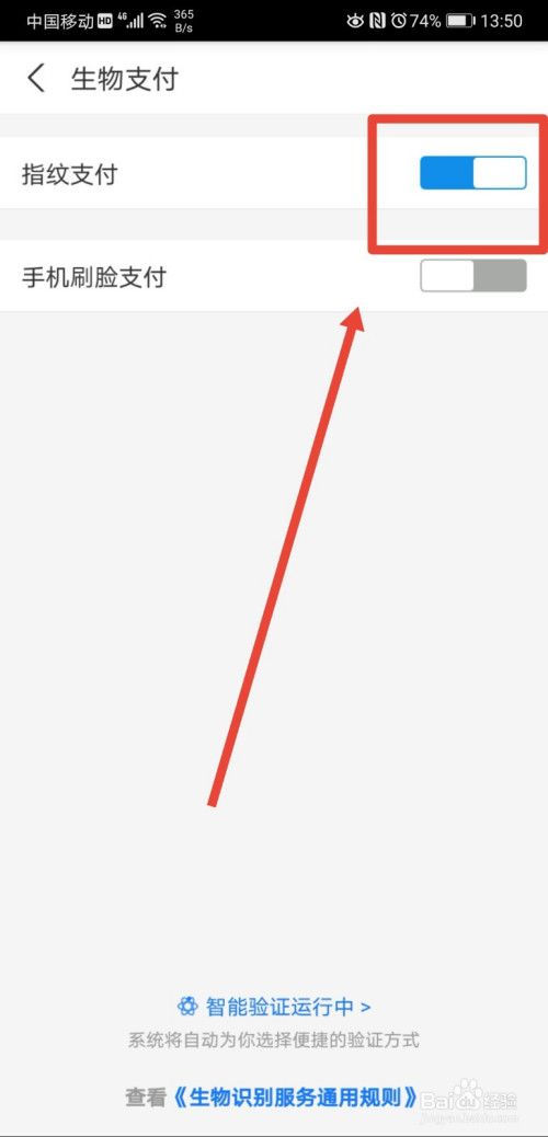 进入到生物支付页面后,我们将指纹支付功能,点击封闭;