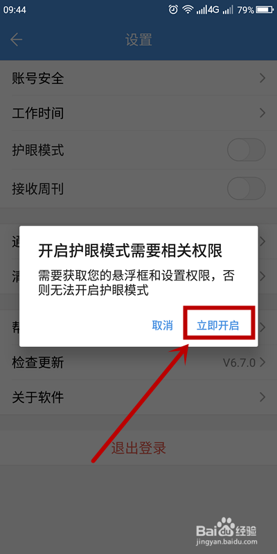 开启护眼模式需要打开响应手机权限,单击弹出对话框中的【当即开启】