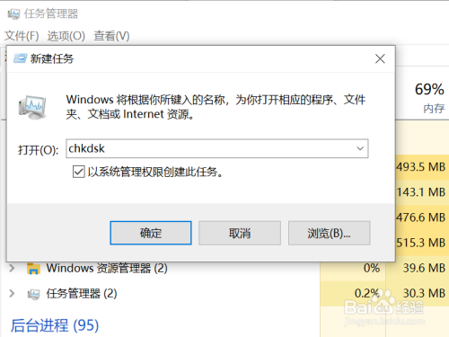 在新建使命窗口输入“chkdsk",并勾选”以办理员身份运行...“;