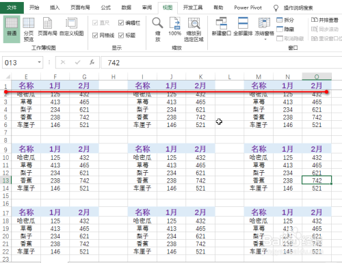 往下移动可以看到,首行已经进行了冻结,具体如图所示: