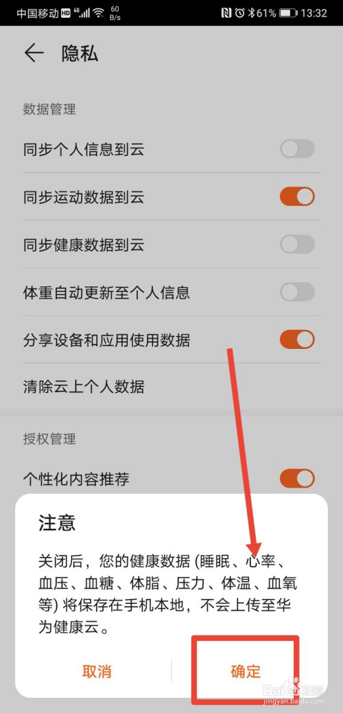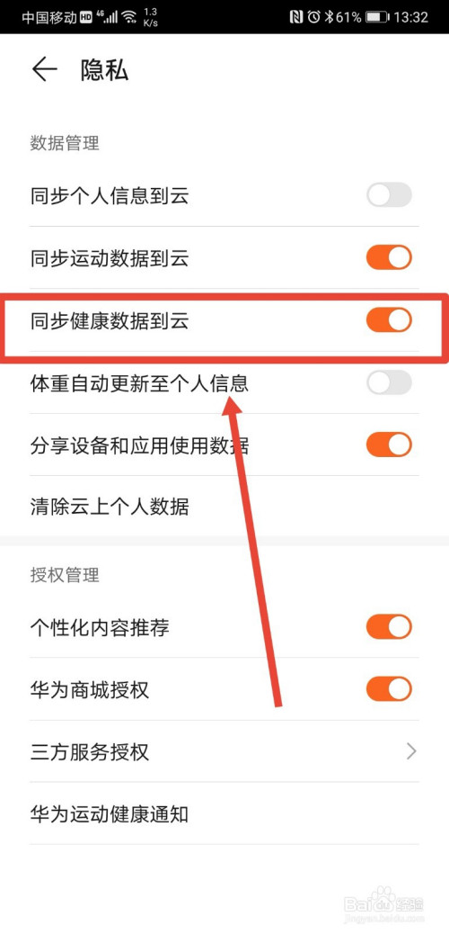 进入到隐私页面后,找到“同步健康数据到云”功能;