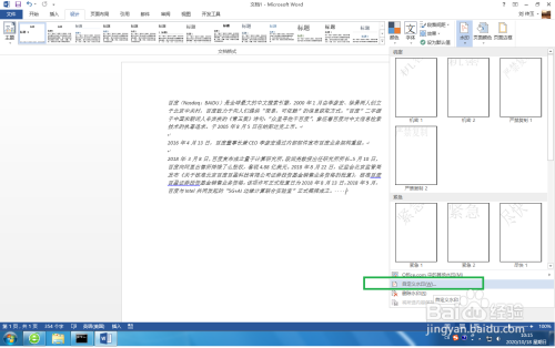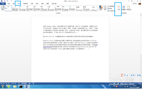 在常用东西栏上选择【设计】,在列表内选择【水印】,如图。