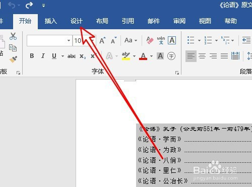 接着选中要编纂的文字后,点击菜单栏的设计菜单。
