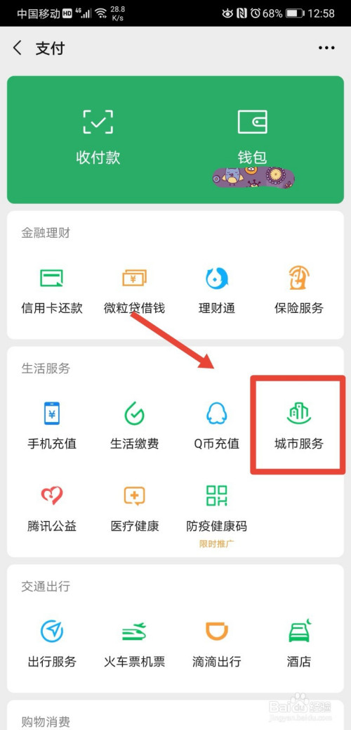 在支付页面,点击进入城市办事功能;
