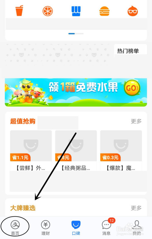 将支付宝页面切换至“首页”。
