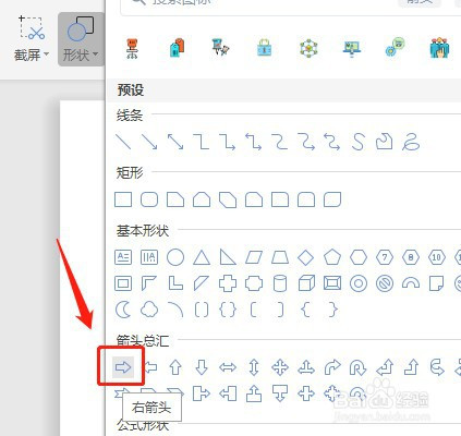 在外形里面找到箭头总汇里面的【右箭头】图标,单击【右箭头】