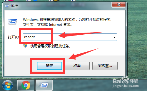 随后输入recent,点击“确定”按钮。