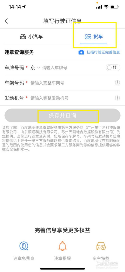 若是是货车就点击货车选项,然后输入信息,点击保留并查询即可。