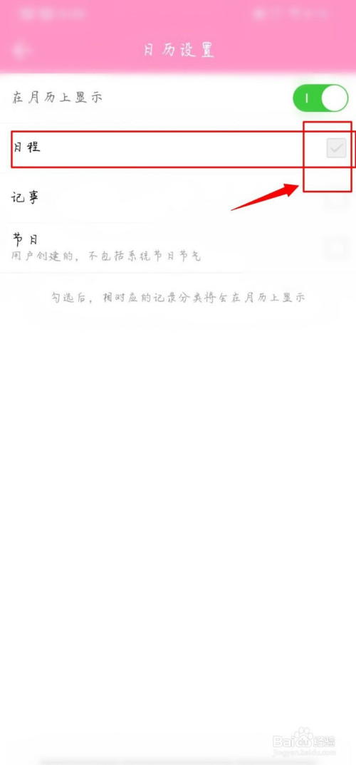 在月历是要显示的记实,我们只能选择日程,记事,节日三种。