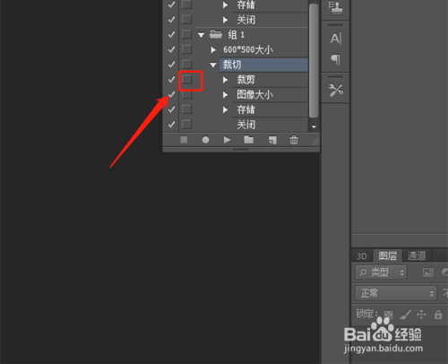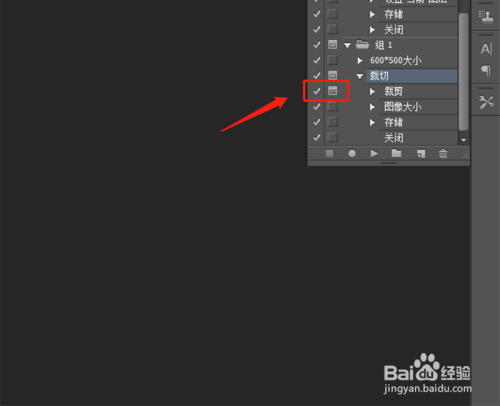 将裁剪的这个动作前面的小方形打开,用鼠标点击就可以打开,这样在执行裁剪这个动作的时辰,会让我们选择区域。
