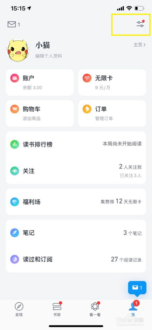 在我的本家儿界面中,点击进入右上角的设置选项。
