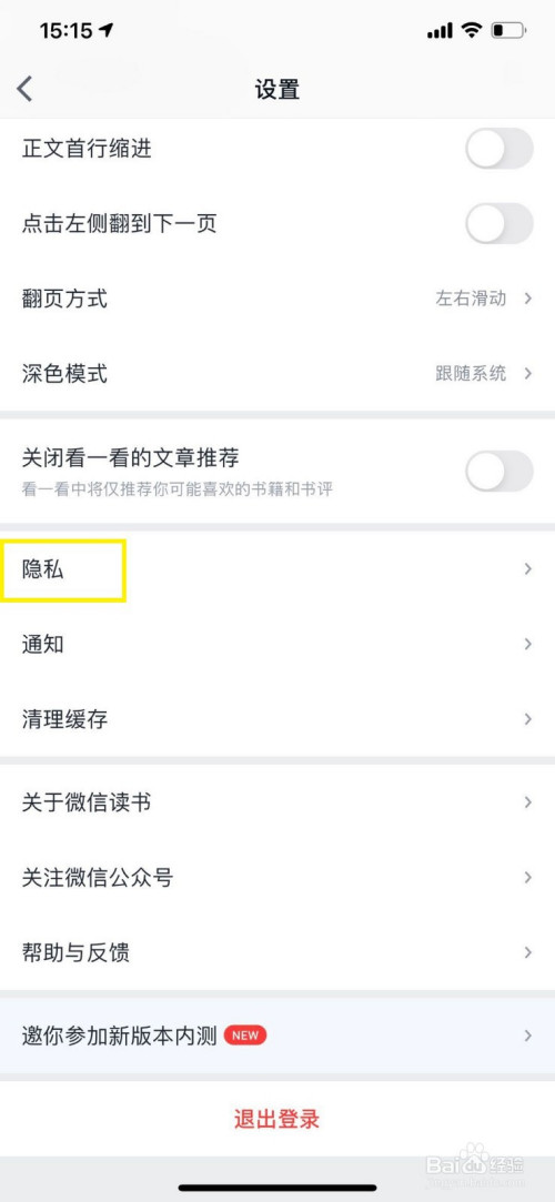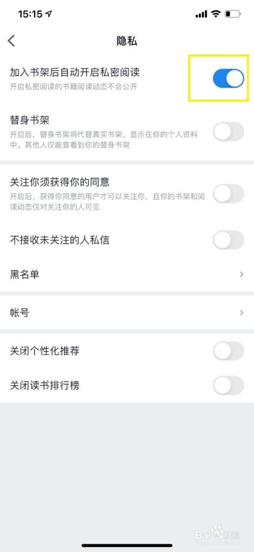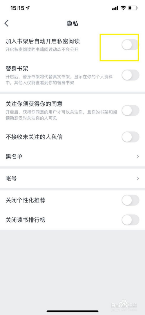 在隐私的本家儿页面中,我们可以看到私密阅读是封闭状况的。