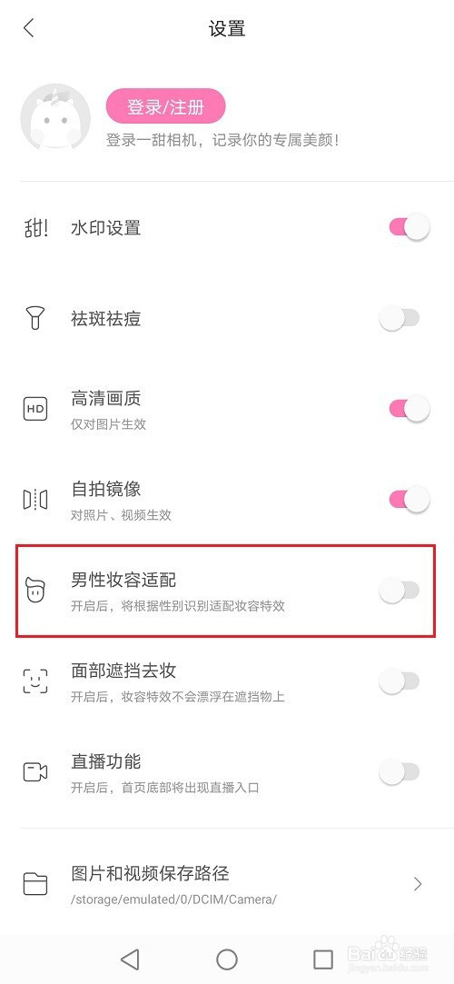 第四步进去一甜相机设置之后,点击封闭男性妆容适配
