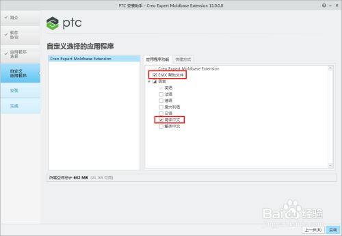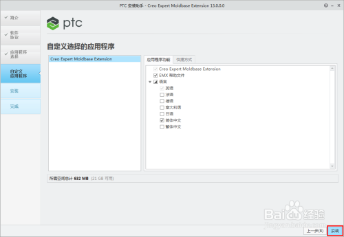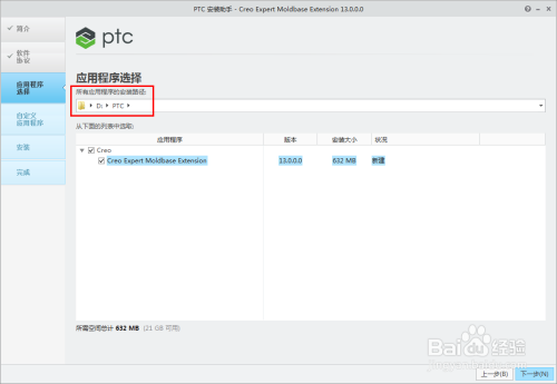 本身界说一个安装目次,默认安装大要需要650m磁盘空间,然后点击“下一步”。