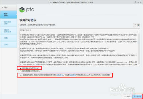 如下图,勾选两个和谈,然后点击刚激活的“下一步”按钮(勾选和谈前按钮灰色不成用)。