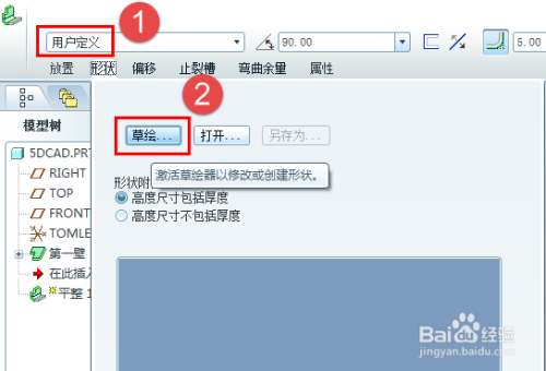 若是选择用户界说,我们需要在外形中打开一个现有草绘外形来利用,或者点击草绘本身建立一个外形。