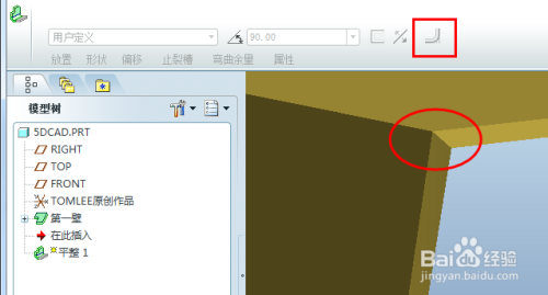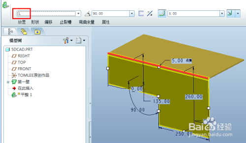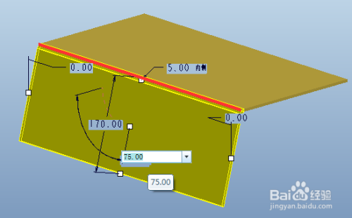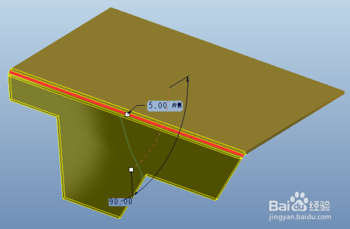 鼠标左键选择现有钣金壁上的一条边,即可默认发生一个90度折弯的平整壁,默认利用内侧折弯半径为壁厚。
