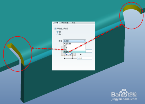 在止裂槽选项卡中,我们也可以选择界说“长圆形”类型的止裂槽。