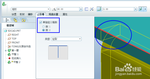 部门边折弯,proe默认就会主动添加止裂槽,本例中两侧都有默认添加“扯裂”类型的止裂槽。
