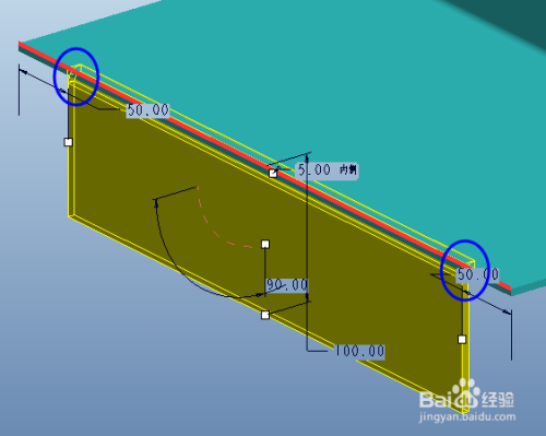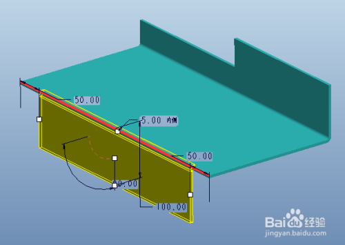 因为是整条边选择折弯,所以两侧都没有折弯,这里我们拖动两侧的小白方框,往内移动,达到部门边折弯壁的结果。