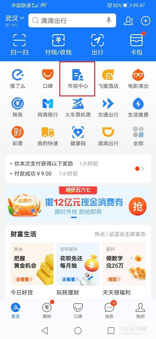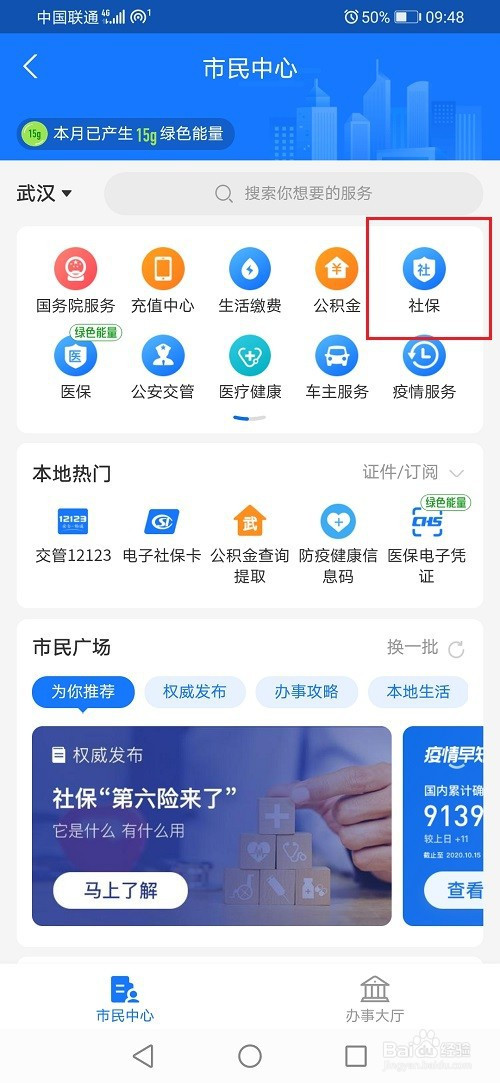 第二步我们可以看一下社保缴纳明细,打开支付宝,点击市民中间,然后点击社保