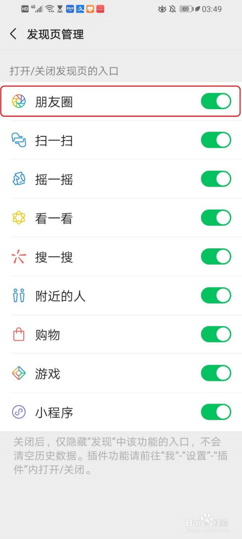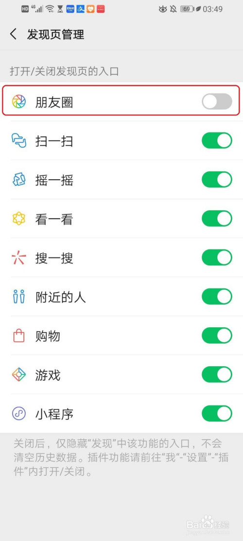 点击”朋友圈“右侧的开关。