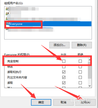 【8】选择“Everyone——勾选——完全节制——许可”点击应用——确定即可。