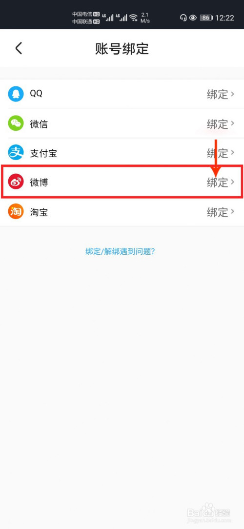 6、点击微博后面的【绑定】。