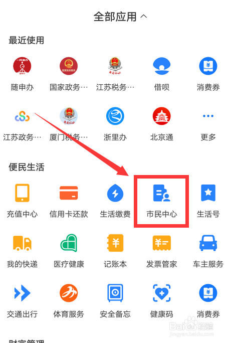 在便民糊口里,找到市民中间,点击打开。