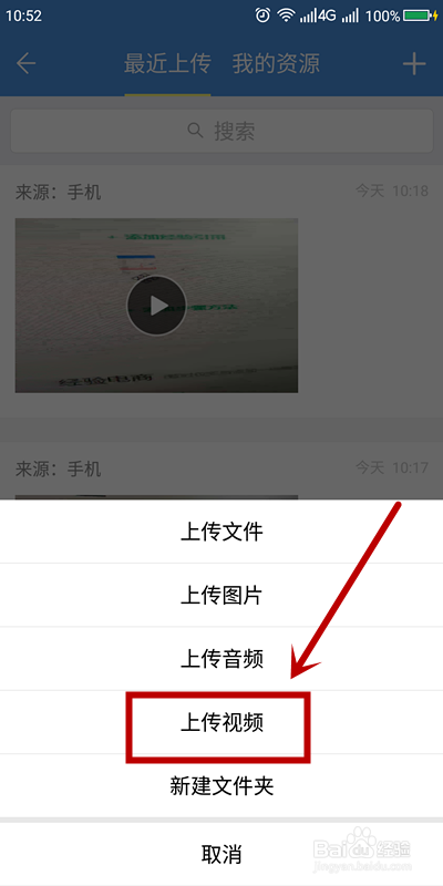 在弹出的资本选择对话框汇中,选摘要上传的文件类型,这里选择【上传视频】