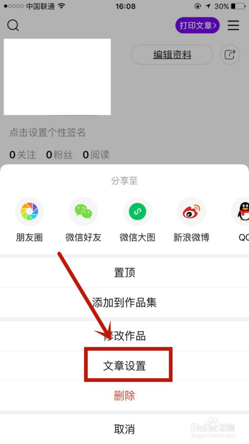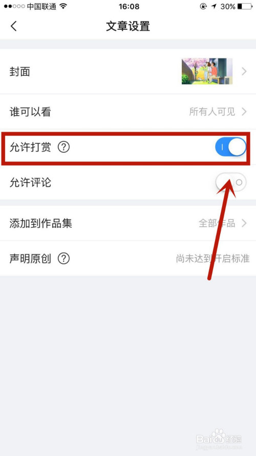 3.点击文章设置,将许可打赏后的按钮点击打开即可。